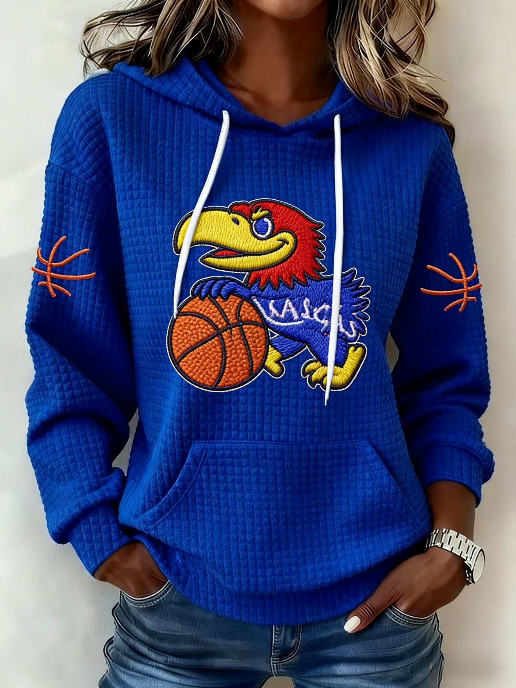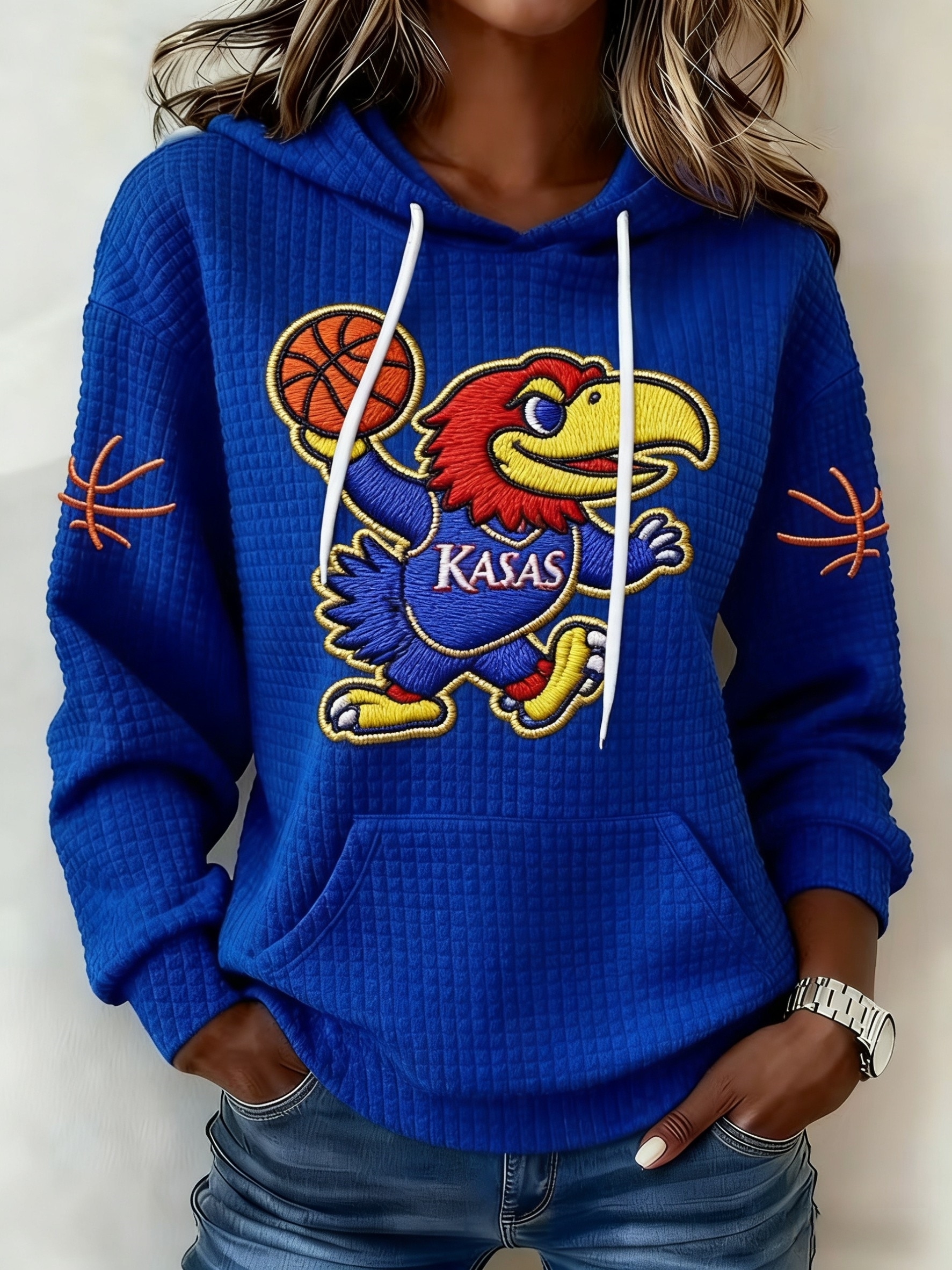 Retro American Basketball Kansas Jayhawks Print Casual Cotton Waffle Hooded Sweatshirt