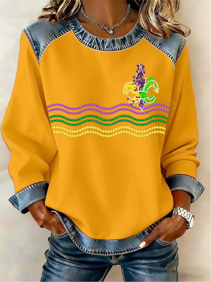 Women's Mardi Gras Fleur De Lis Ribbed Round-Neck Sweatshirt