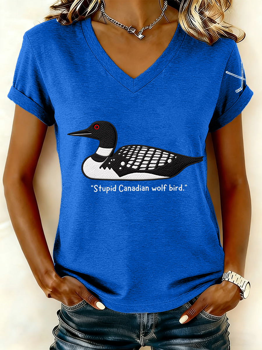 Women's Stupid Canadian Wolf Bird Embroidered V-Neck T-Shirt