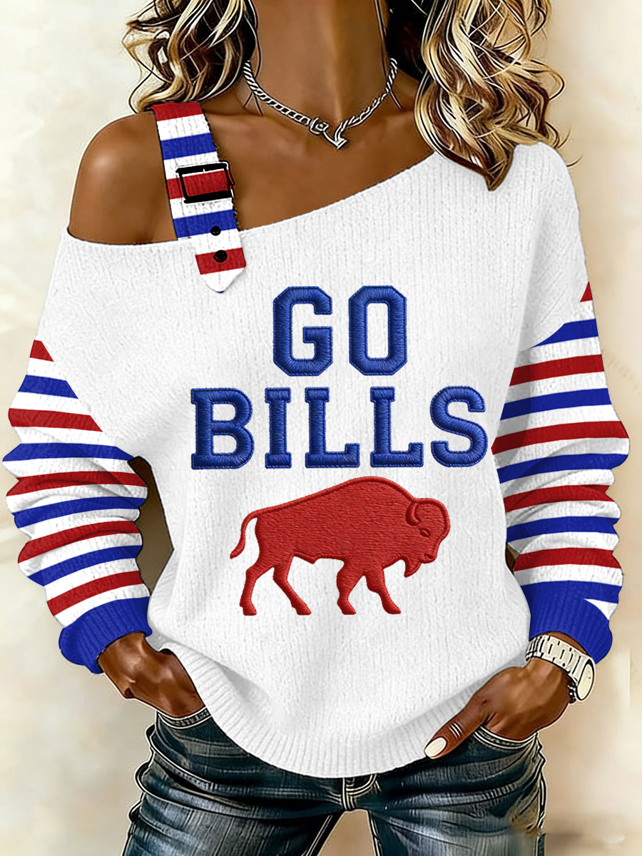 Women's Go Bills Stripes Print Football Fans Gameday Casual Off-Shoulder Topt