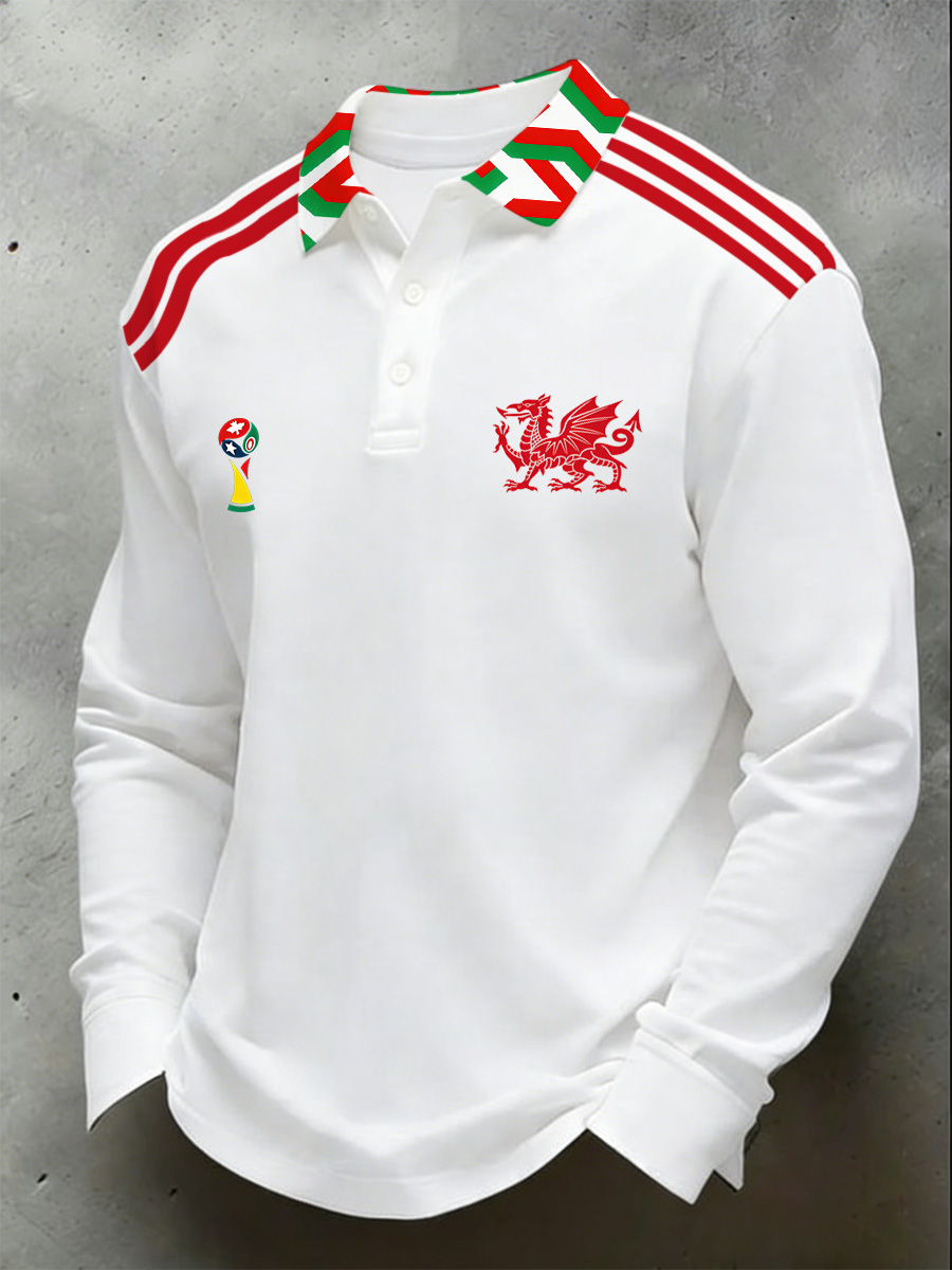Men's Wales World Cup Football Supporter Print Long-Sleeved Polo Shirt