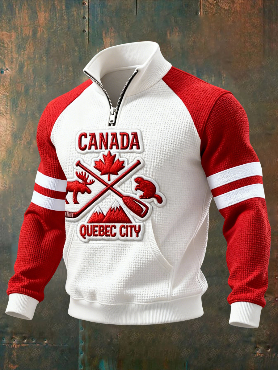 Retro Canadian Hockey Maple Leaf Patchwork Zipper Waffle Knit Pullover