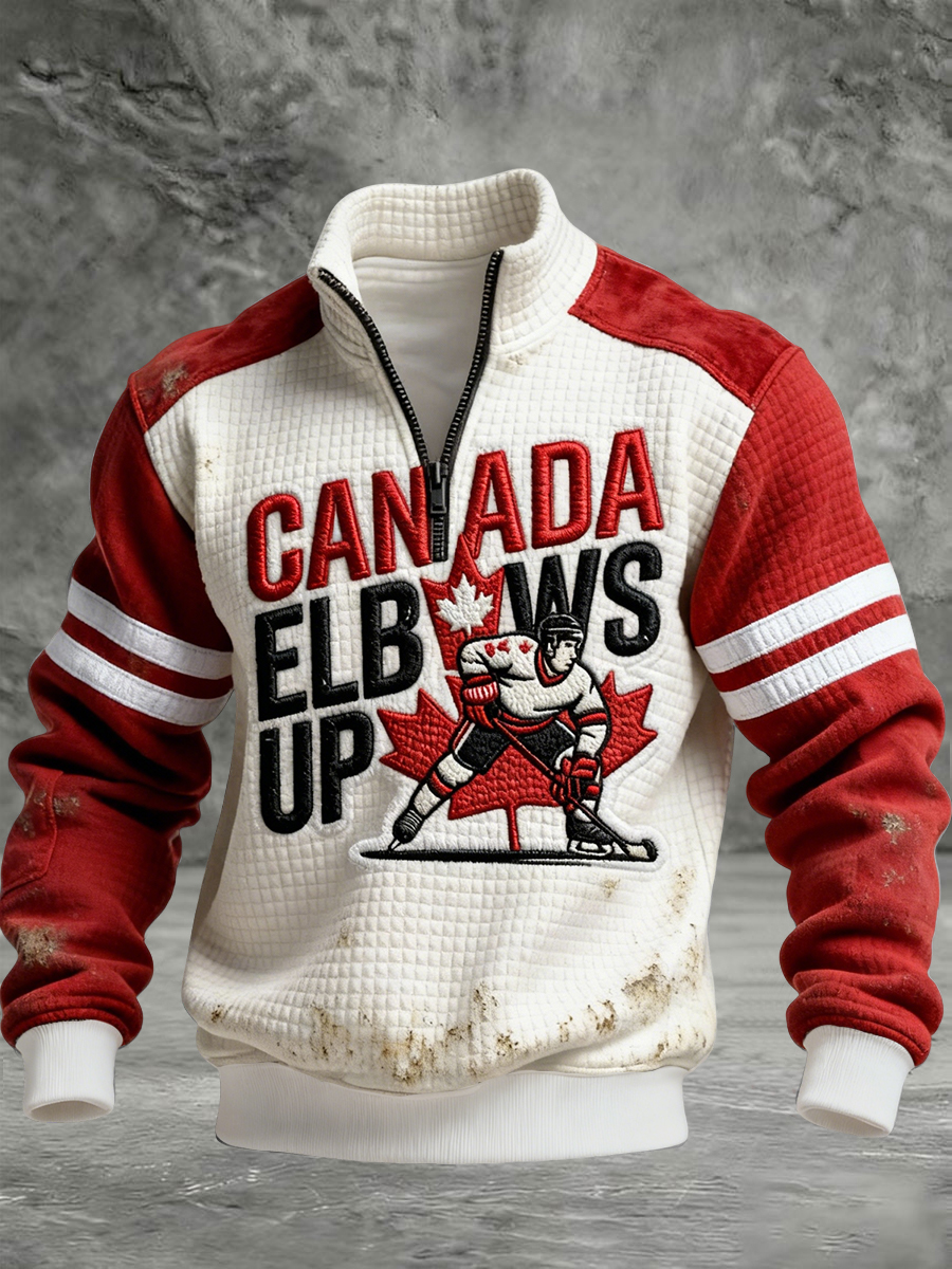 Retro Canadian Hockey Maple Leaf Zipper Waffle Knit Pullover